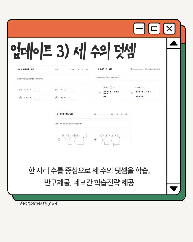 10의 보수를 포함 여부를 표시하여 10의 보수를 활용하는 경우 세 수의 덧셈을 효과적으로 학습할 수 있습니다.